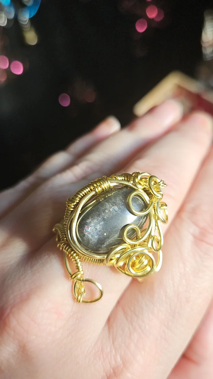 Cette bague en or sertie de Pierre de Lune Noire (Hécatolite) accompagne en douceur les énergies féminines.