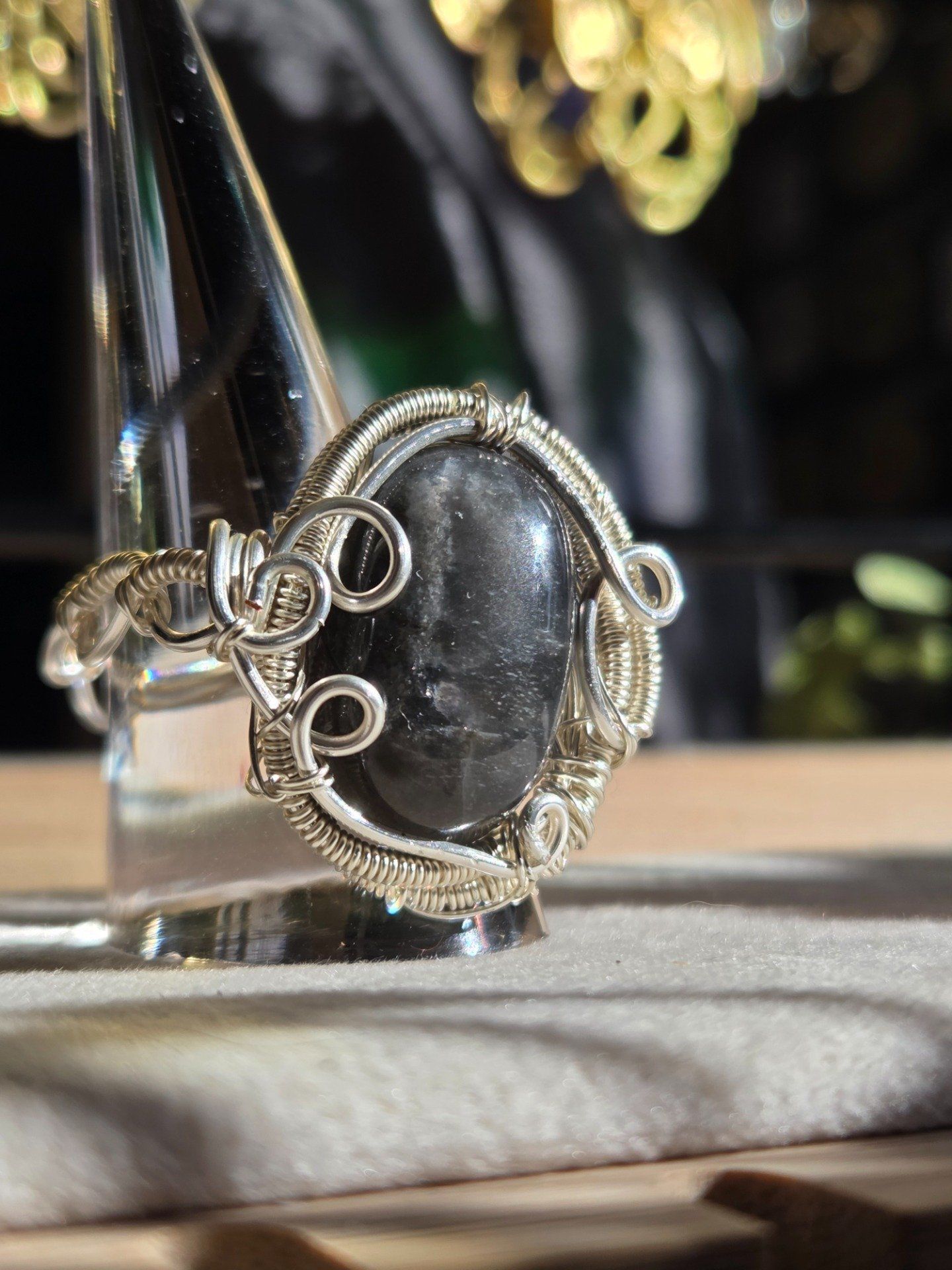 Cette bague en or sertie de Pierre de Lune Noire (Hécatolite) accompagne en douceur les énergies féminines.
