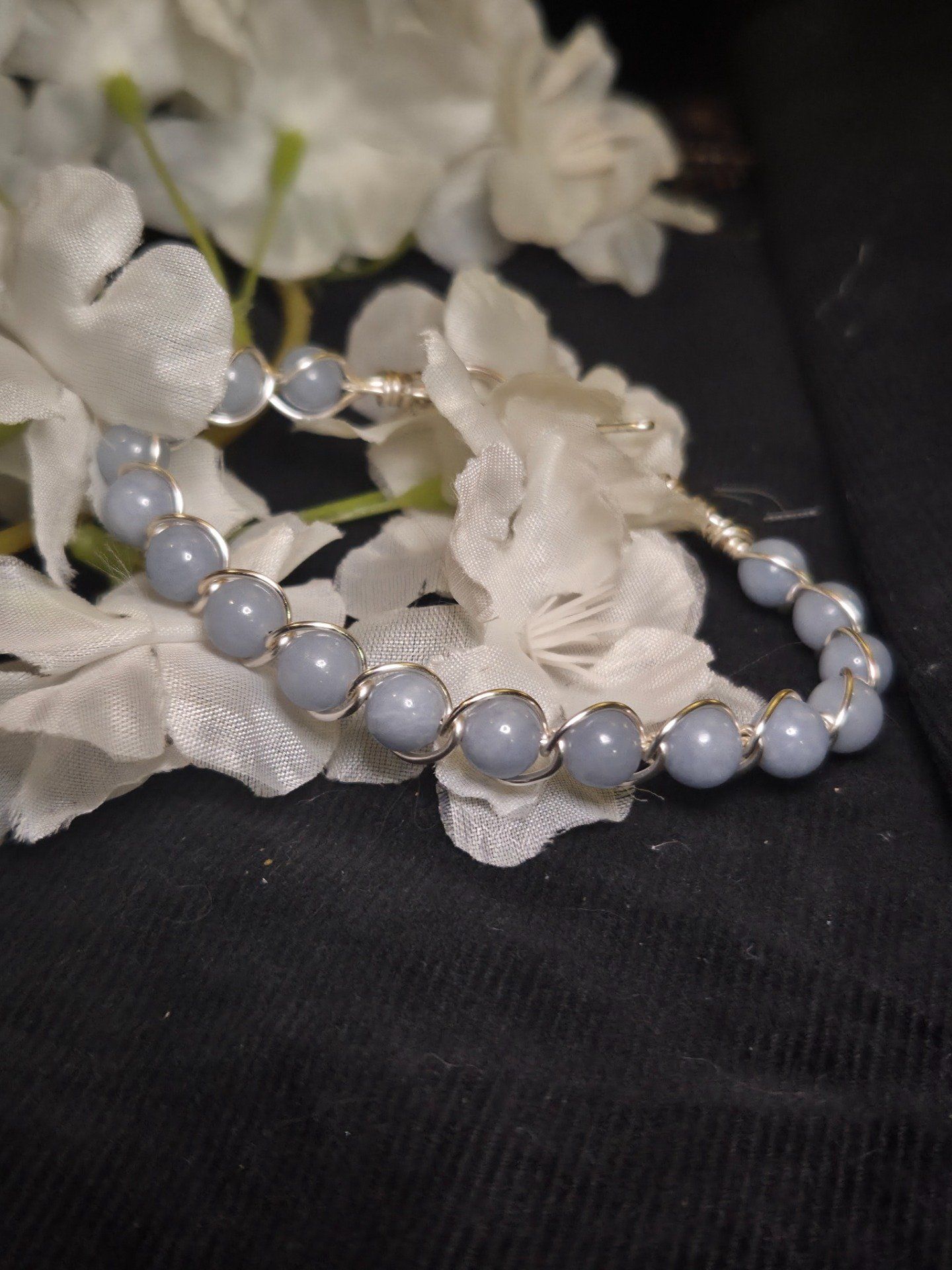 - Pierre : Angélite bleue naturelle, polie à la main – chaque perle est unique.