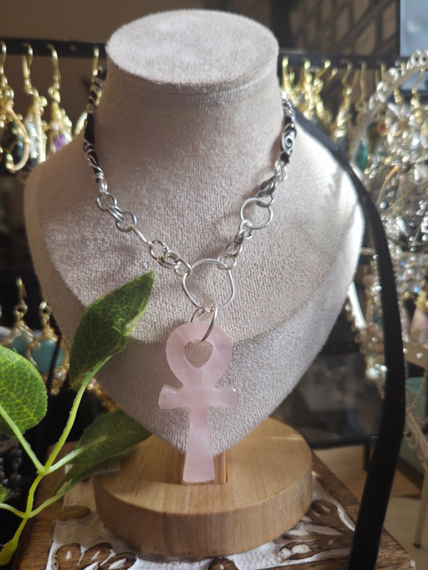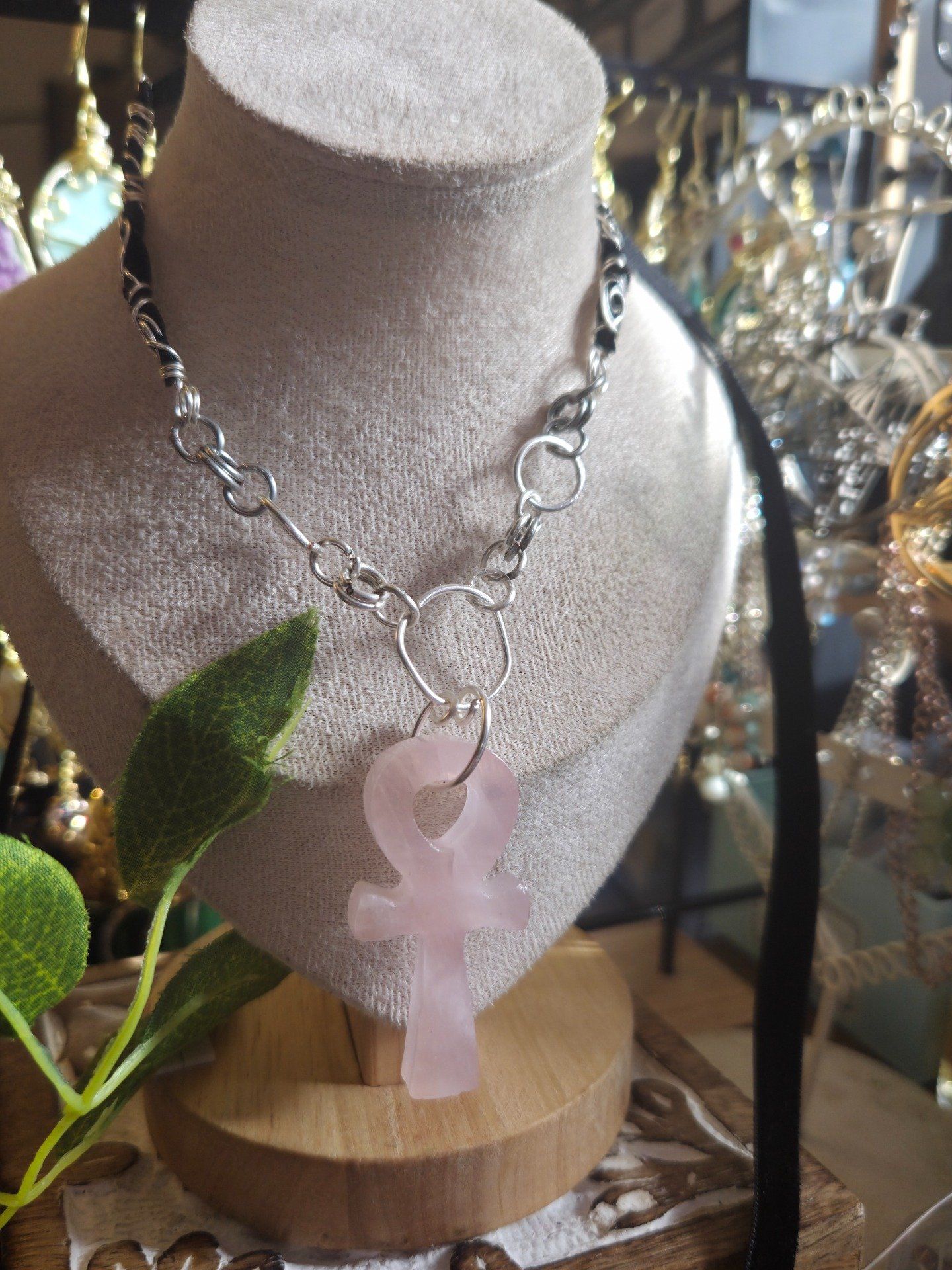 Collier Ankh Quartz rose , La Pierre De L’Amour Et De La Douceur