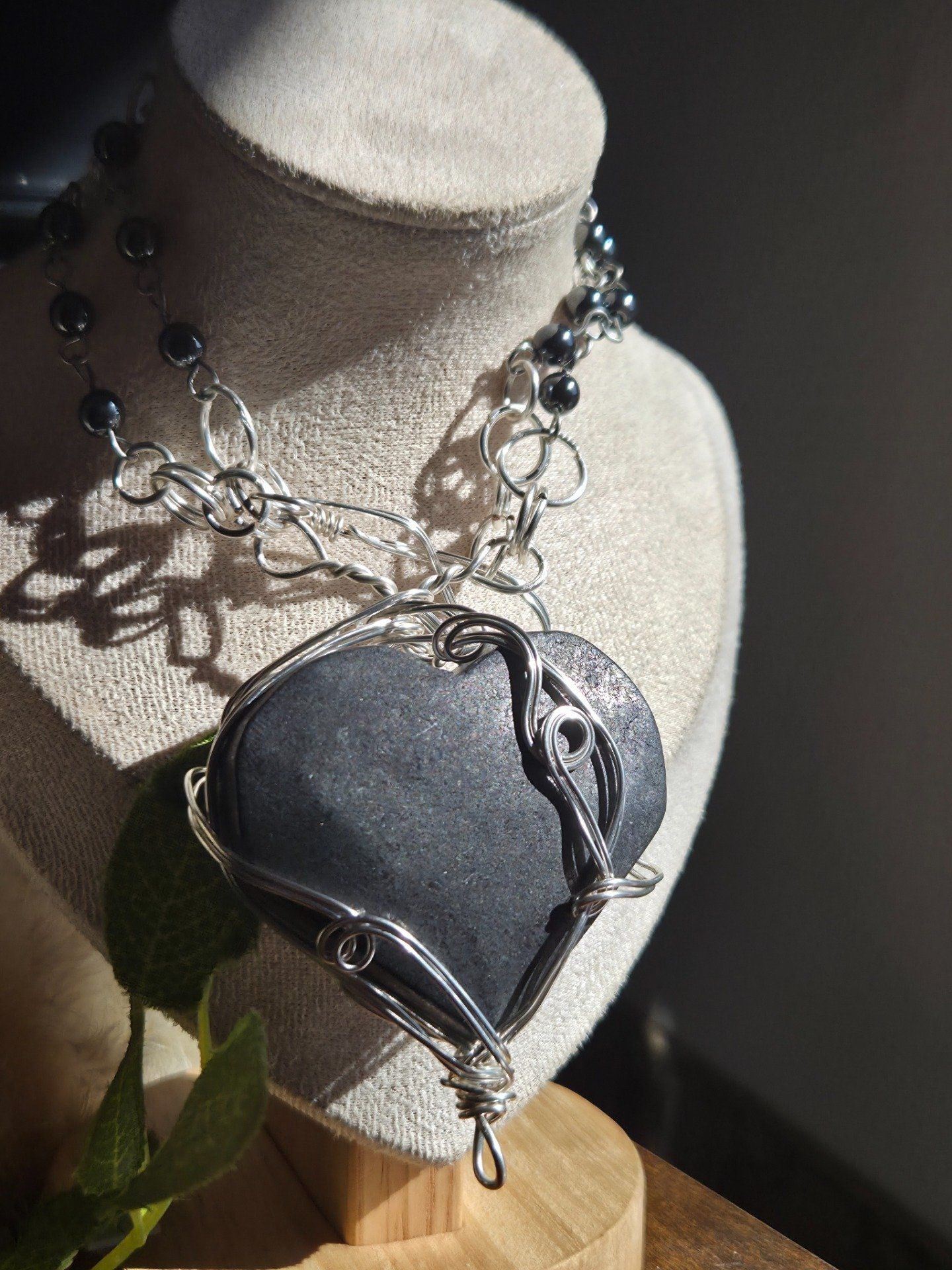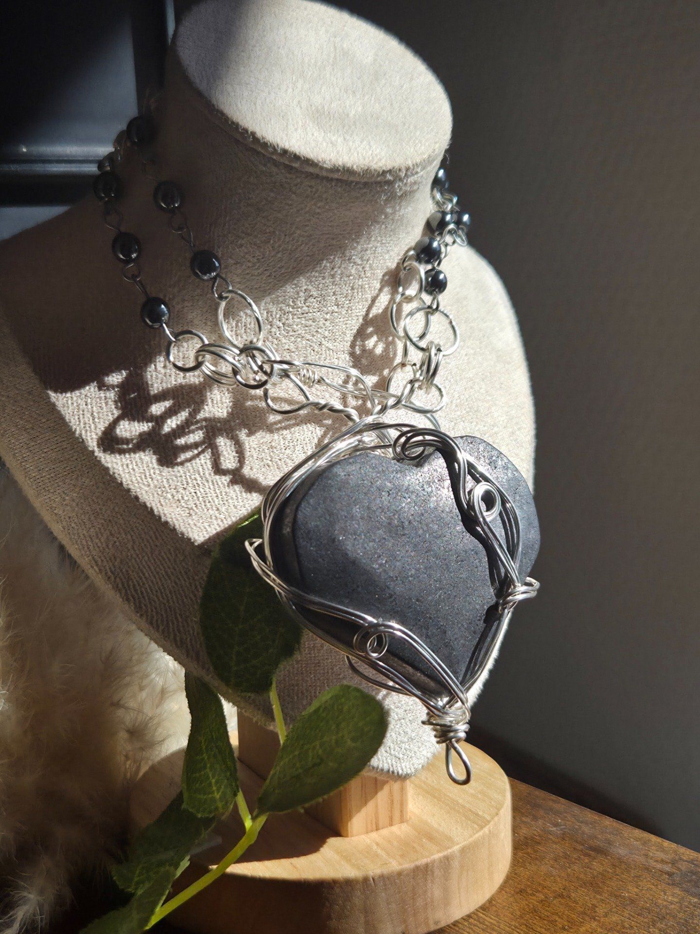shungite, hematite, collier coeur, protection, ancrage, lithotherapie, energie, bijou artisanal, pierre naturelle, equilibre