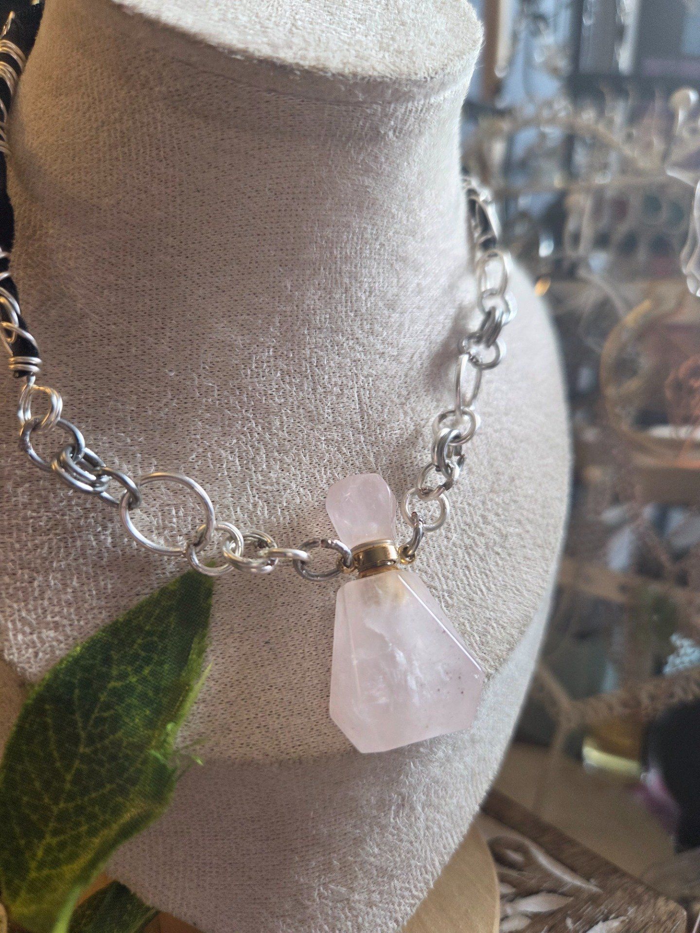 Ce collier fiole en quartz rose allie beauté et intention. Il permet de contenir parfum, huile ou élixir tout en diffusant une énergie douce et réconfortante liée à la pierre d’amour par excellence.