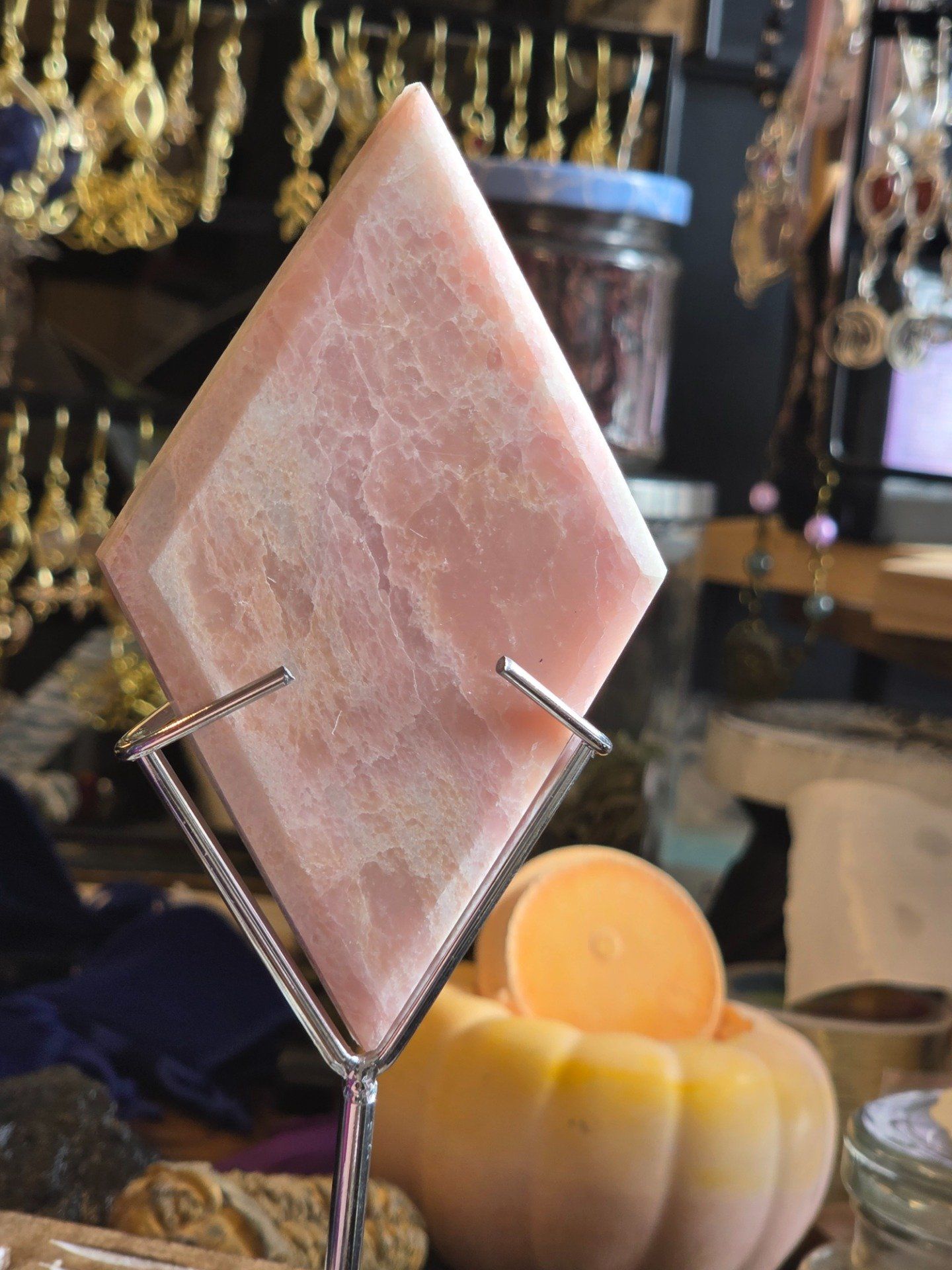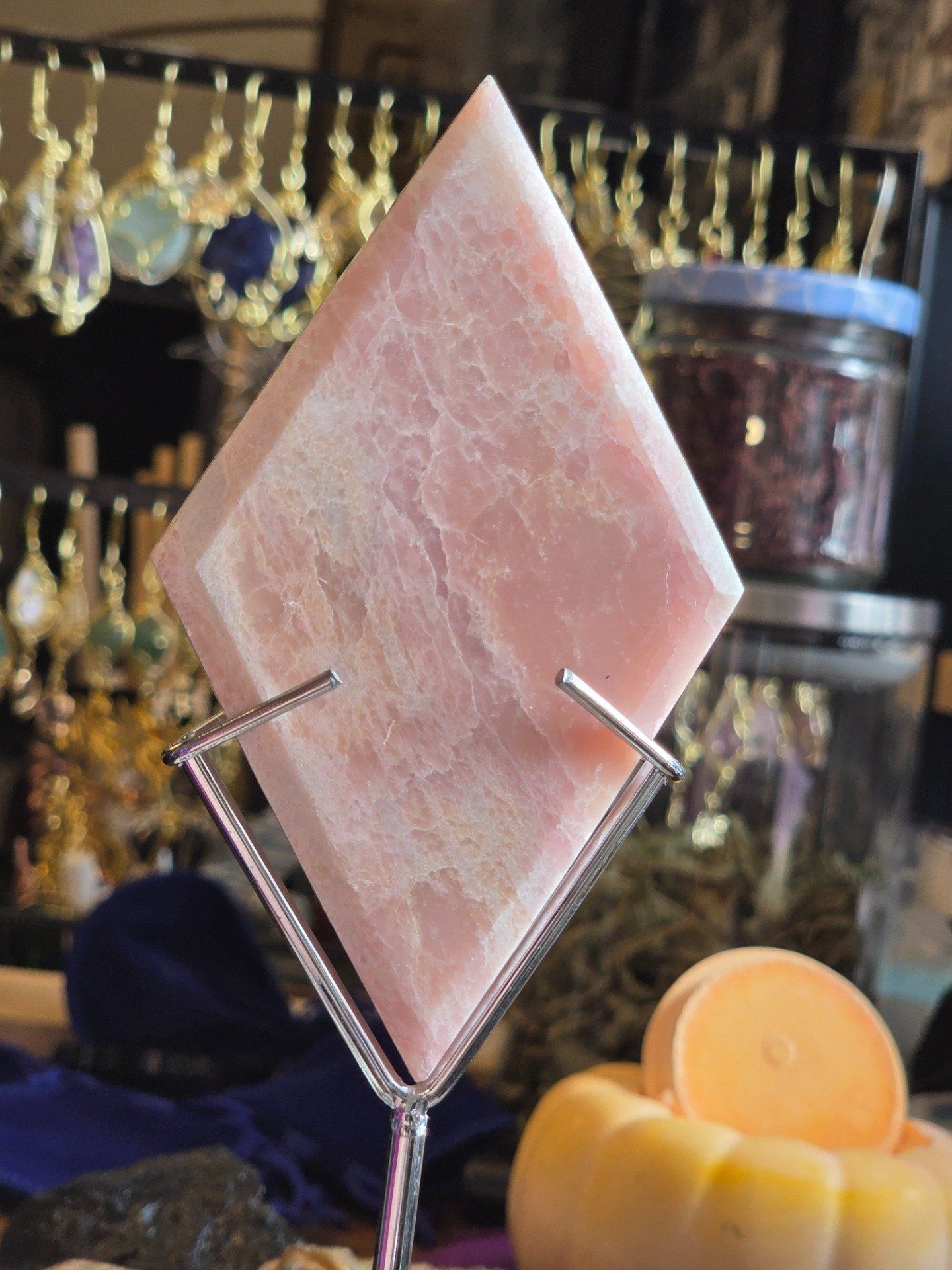 Forme décorative en losange sur socle, pierre naturelle Opale Rose. Apporte harmonie, protection émotionnelle et énergie douce pour le cœur.