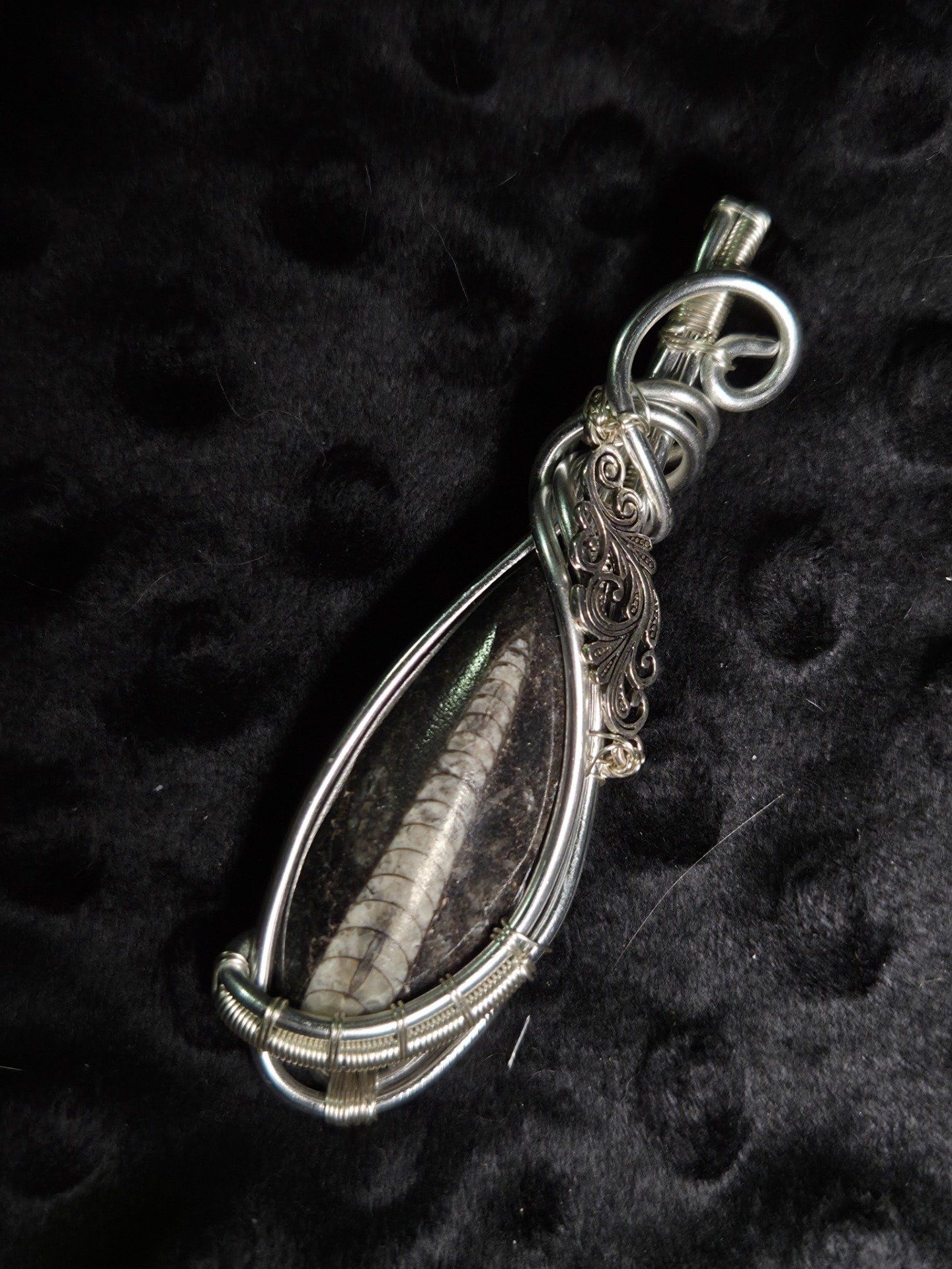 Cette amulette est ornée d’un fossile Orthoceras Straight Horn, vestige marin datant