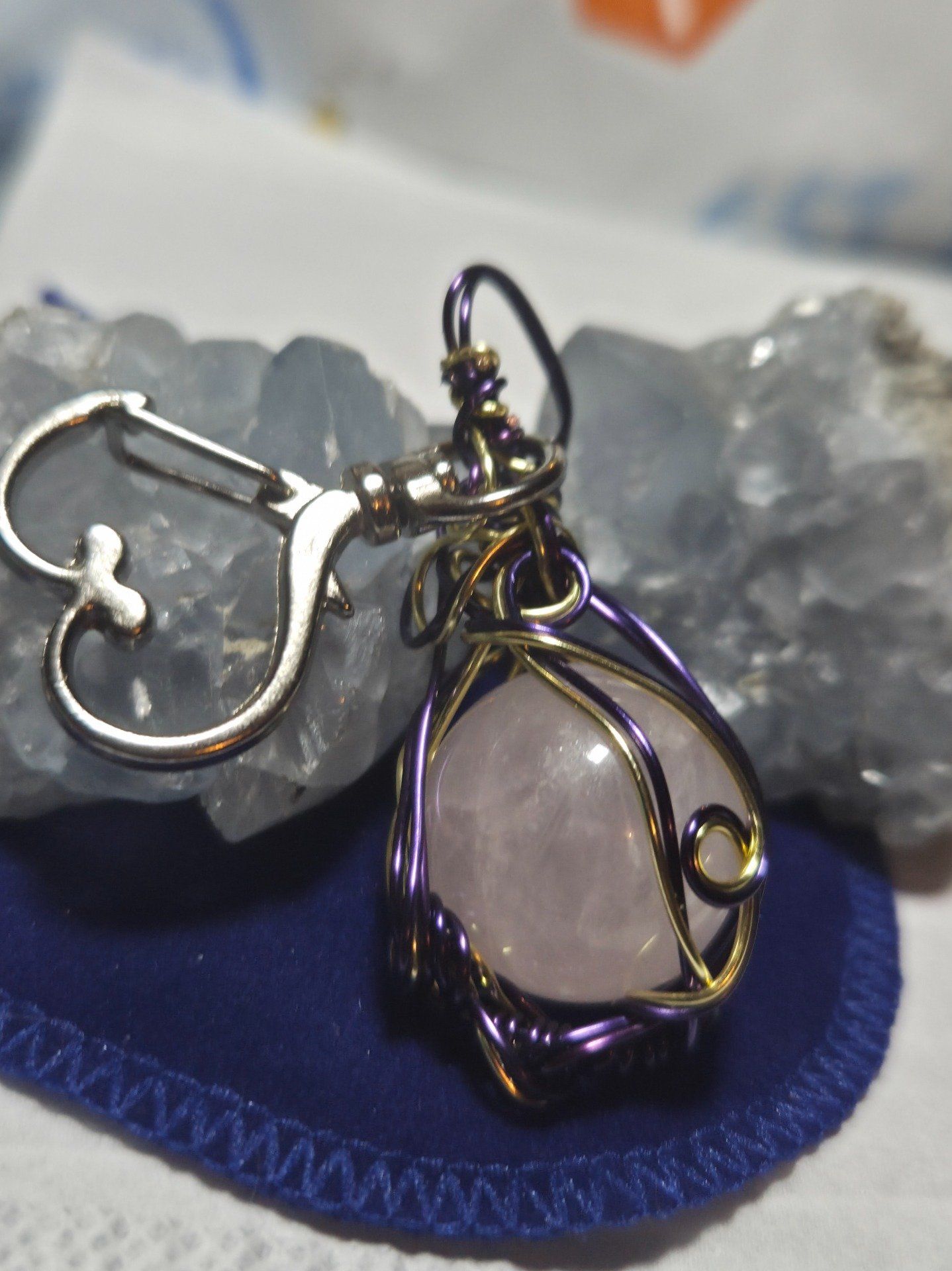 Ce porte clé en Quartz Rose, façonné à la main en wire wrapping, allie la tendresse de cette pierre à la puissance protectrice du cuivre recouvert d’argent. Connu comme la pierre de l’amour, il diffuse une énergie bienveillante et réconfortante, favorisant l’ouverture du cœur et l’harmonie intérieure.