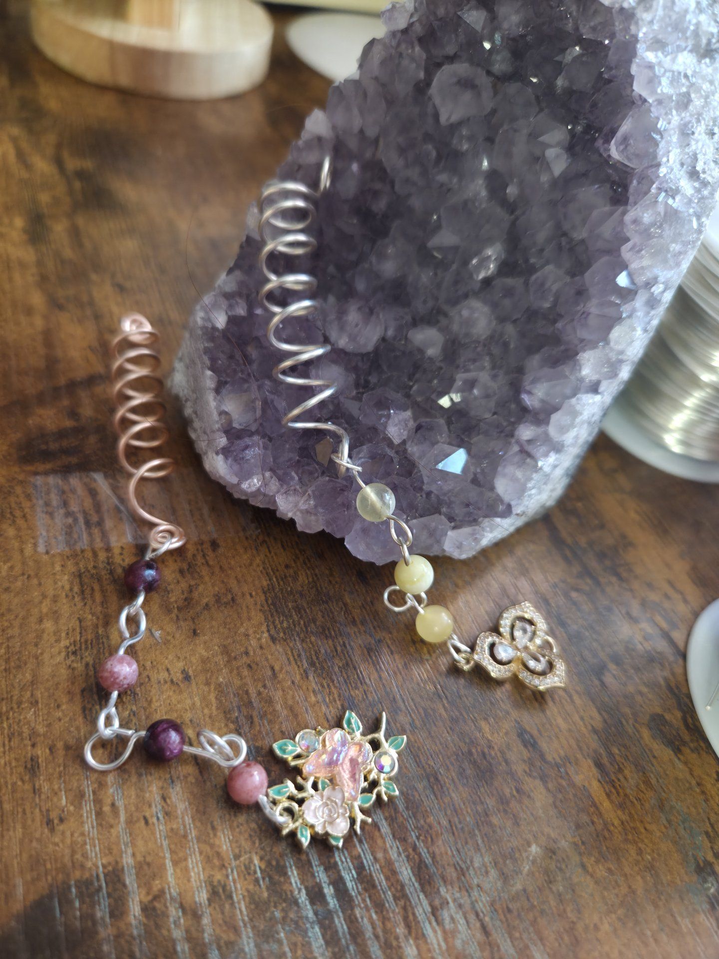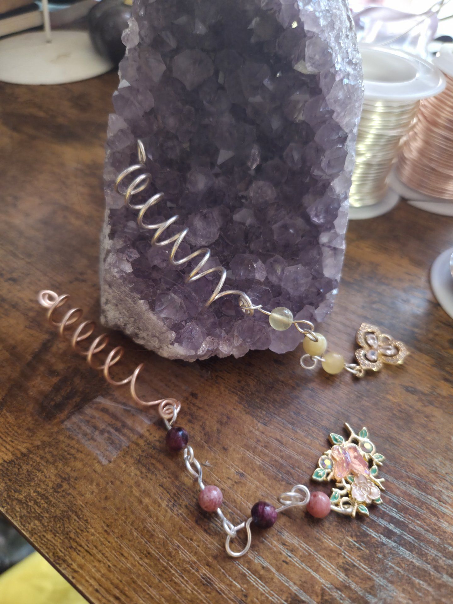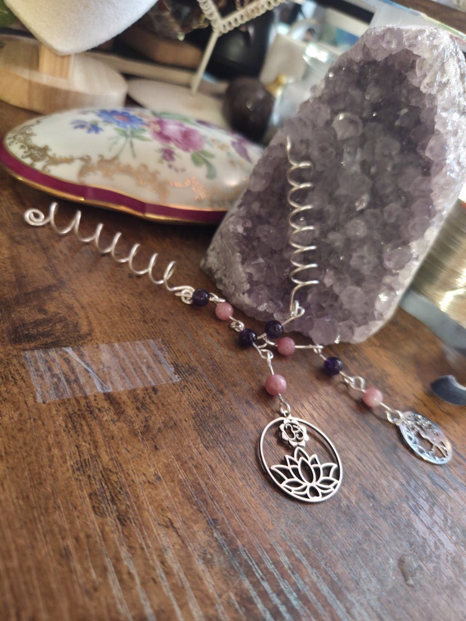 Tortillon acheveux avec perles améthystes et jaspe sakura, couleur argent et breloque sur mesure.